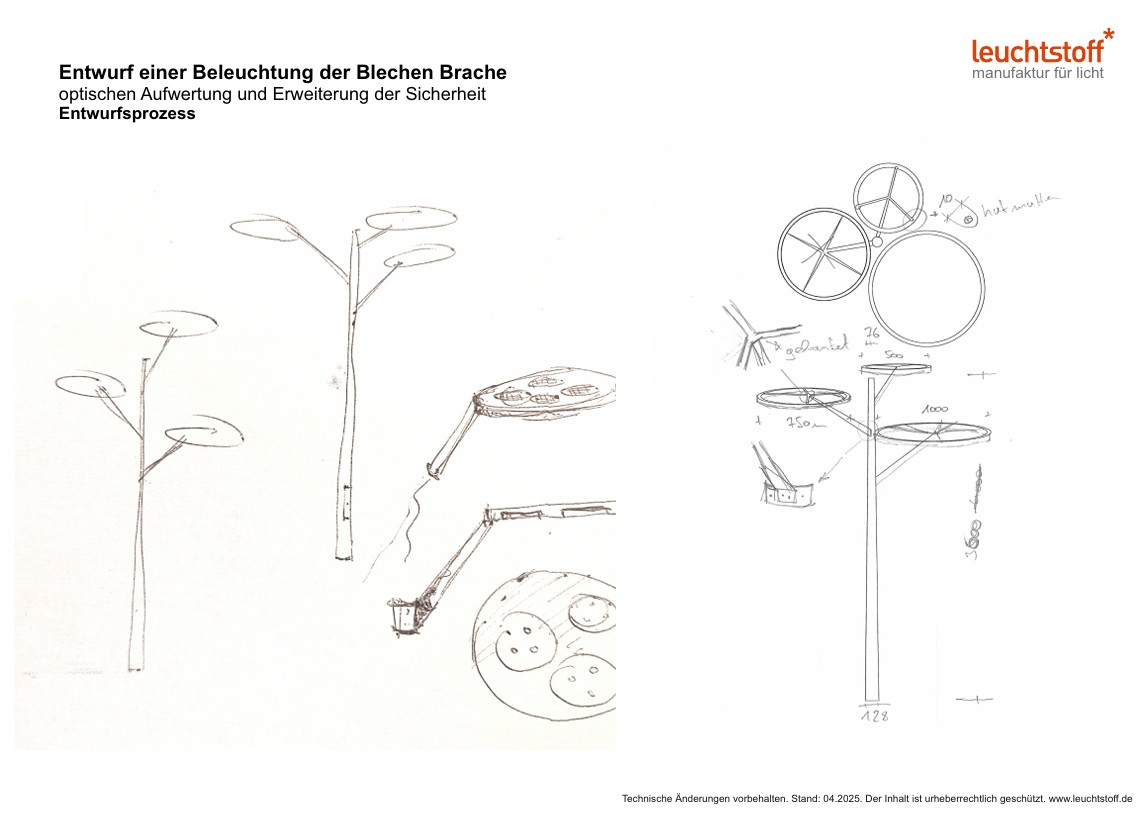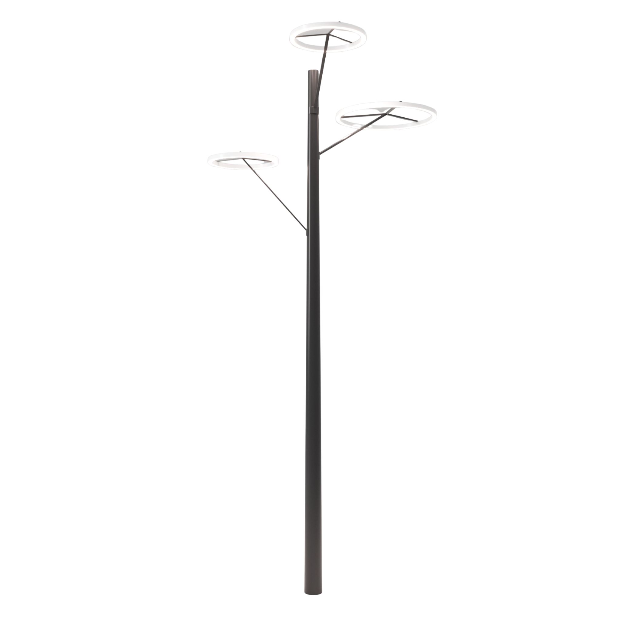 Der Entwurf basiert auf einem durchdachten System: Der Hauptdurchmesser der Leuchten beträgt 500 mm. Die Leuchtenarme messen drei Viertel dieses Maßes – ein Verhältnis, das sich neunmal entlang des Masts wiederholt. In drei Höhenebenen angeordnet, vermitteln die ringförmigen Arme den Eindruck von Ästen. Je nach Ausführung besitzen die „Blüten“ Durchmesser von 500, 750 oder 1000 mm.